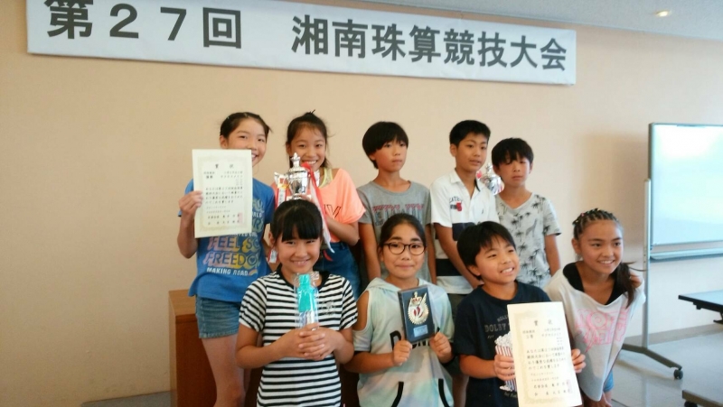 去る7月8日(日)に茅ヶ崎商工会議所いて第27回湘南珠算競技大会が行われました。参加人数208名の生徒が参加し、小学二年生の以下の部~中学・高校・一般の部計6部門により個人総合競技・読上算・読上暗算競技・団体競技の部門が行われました。