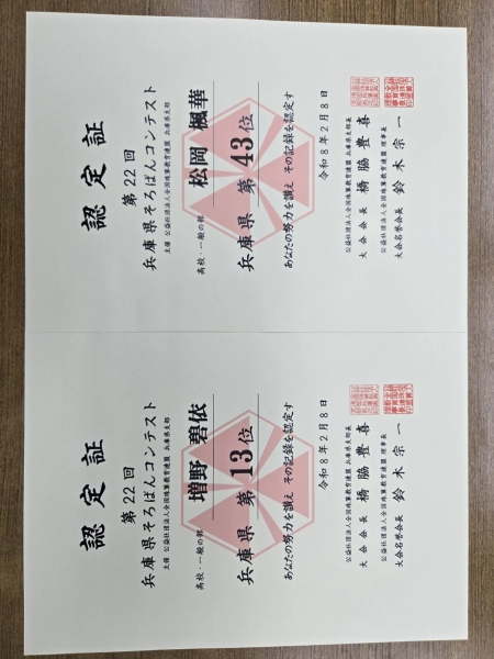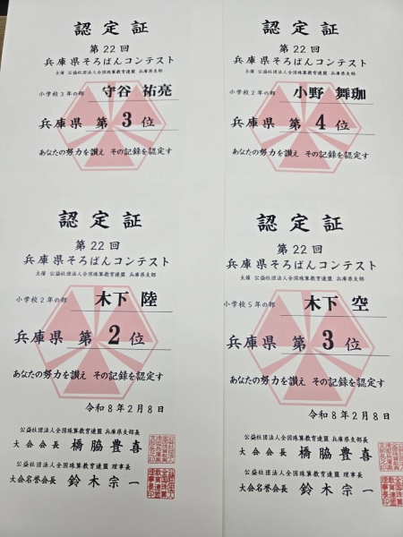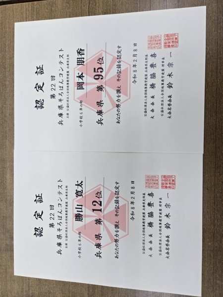 第22回兵庫県そろばんコンテスト100位入賞者