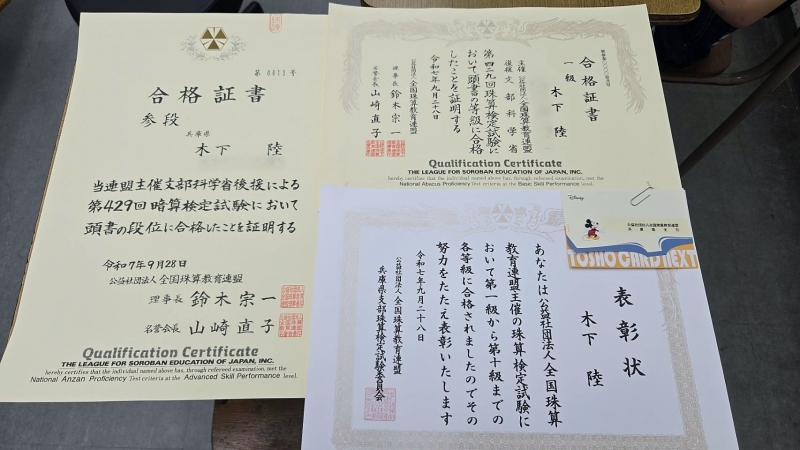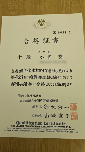 当教室では、洋平くんの暗算十段、碧依ちゃんの暗算十段&珠算十段に続き、4つ目の十段となりました!