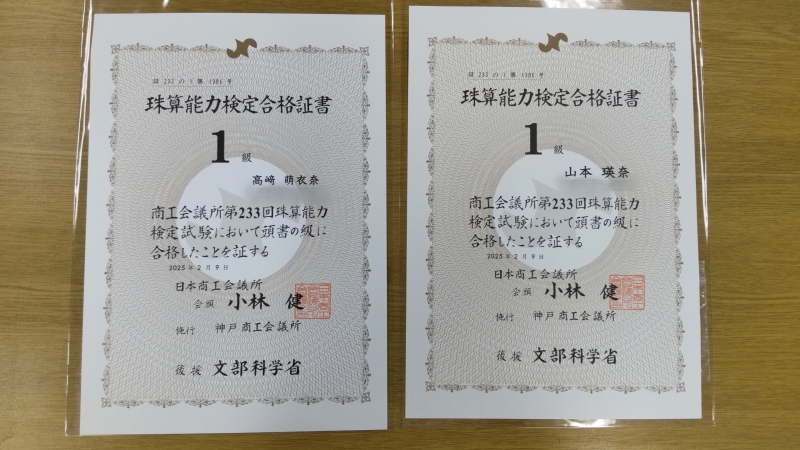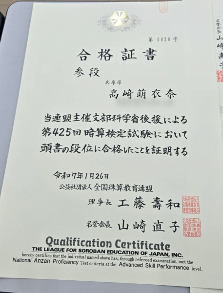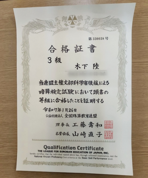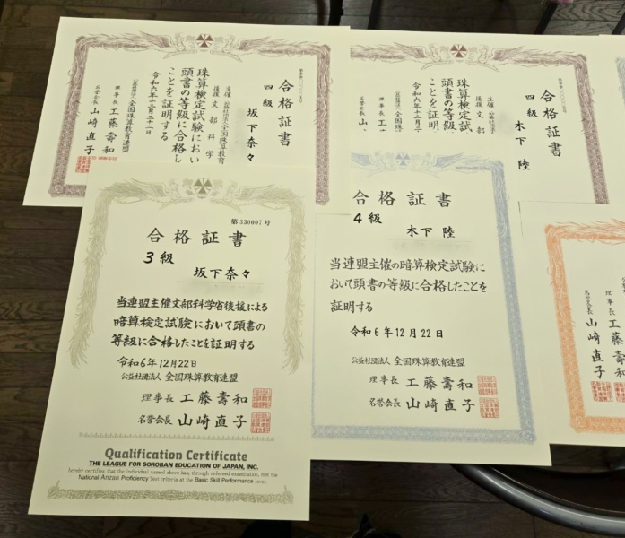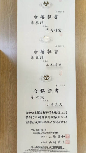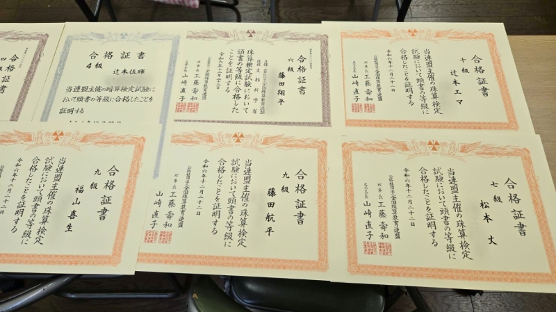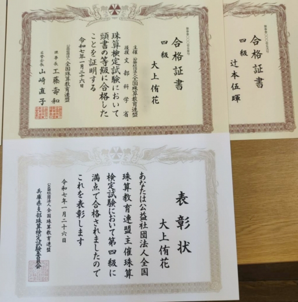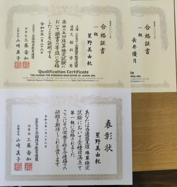 今回は珠算1級満点合格が出ました!!
