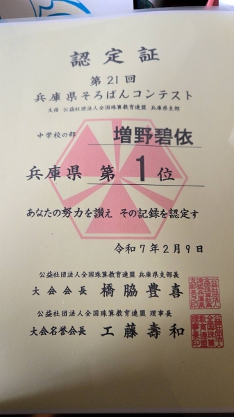 第21回兵庫県そろばんコンテスト100位入賞者