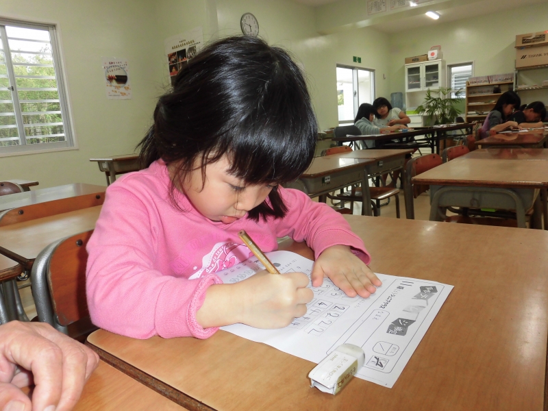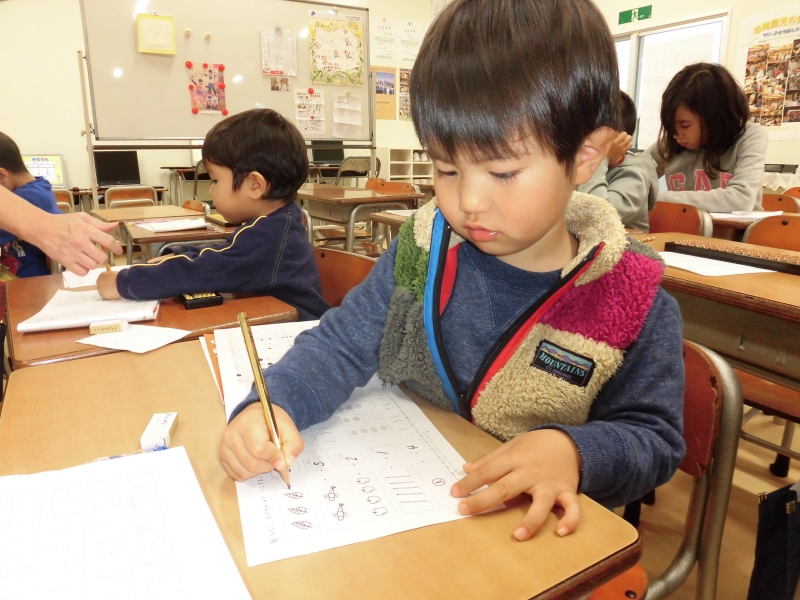 泣き虫だった子も今では一人で座ってお勉強できるね。