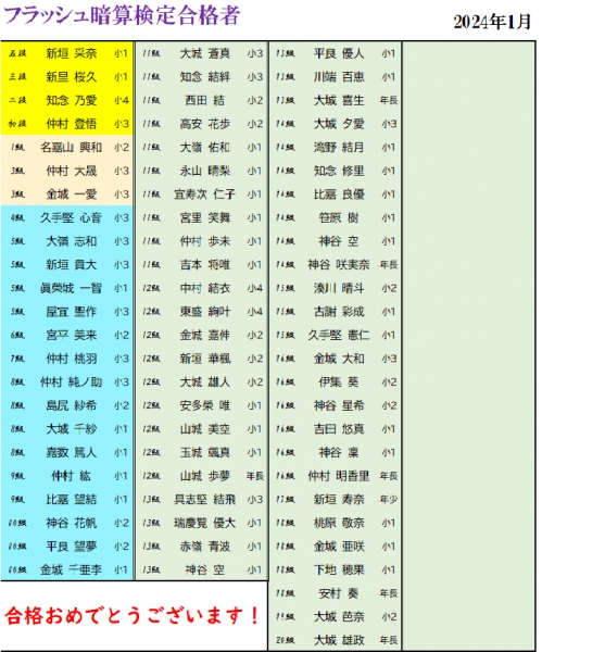 フラッシュ暗算検定合格者一覧です。