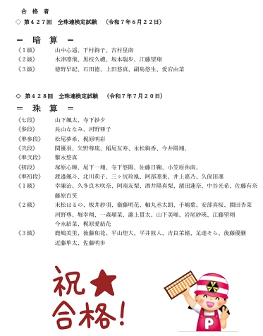 第427回6月・第428回7月検定試験の合格者を発表します。