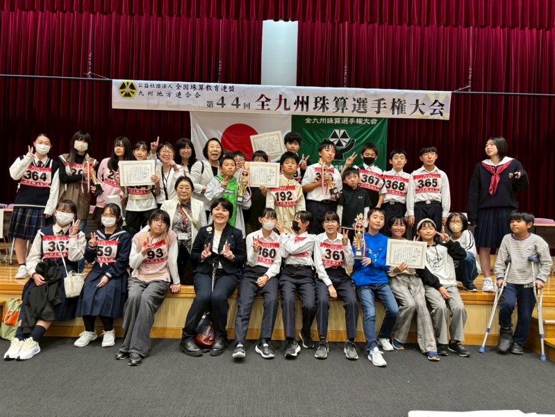 令和7年11月9日 鹿児島県市町村自治会館に於いて第44回全九州珠算選手権大会が開催されました。九州沖縄から各県代表260名が参加、大分県からは小学生14名 中学生11名 高校生1名が参加しました。