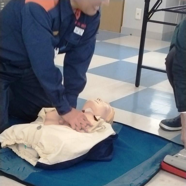 講習会の内容は、現役の消防士さんによる救命教室で、心肺蘇生やAEDの使い方などについて学びました。