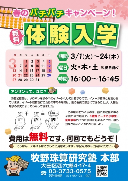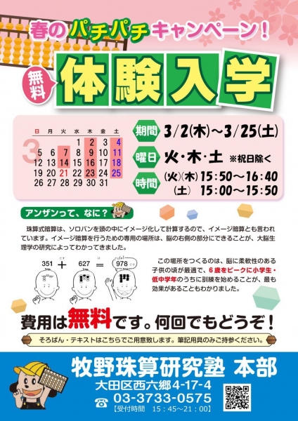 春☆新学期の前に、そろばん・暗算で新しい扉を開けてください。