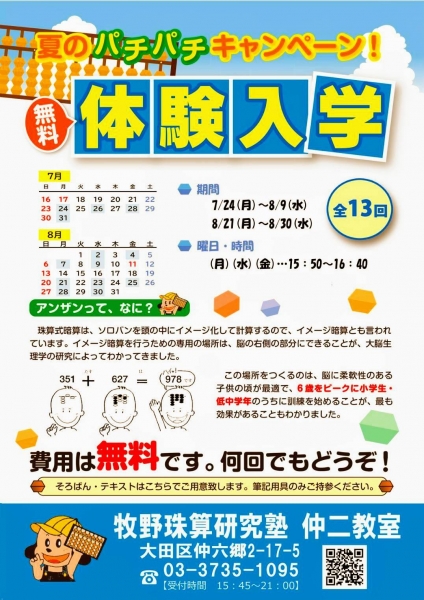 今年も学校の夏休みを利用した、そろばん塾の体験練習がスタートします。