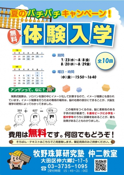 今年もご好評いただいております、夏の体験入塾がスタートします。