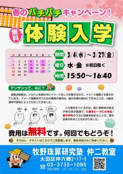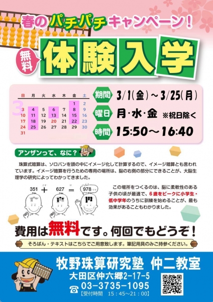 春☆新学期の前に、そろばん・暗算で新しい扉を開けてください。