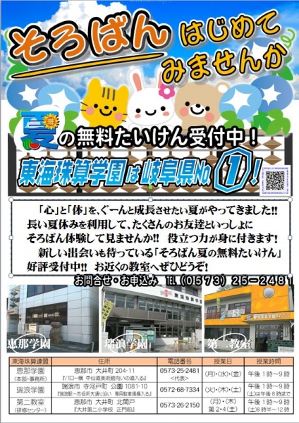 そろばん無料たいけんで、身に付く役立つ夏にしよう!お問合せはお気軽に!