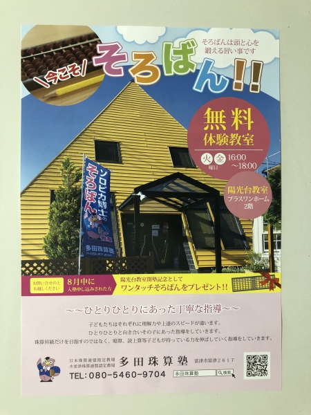 陽光台教室開塾記念として8月中に富津教室、陽光台教室に入塾申し込みされた方にはワンタッチそろばんをプレゼントします!