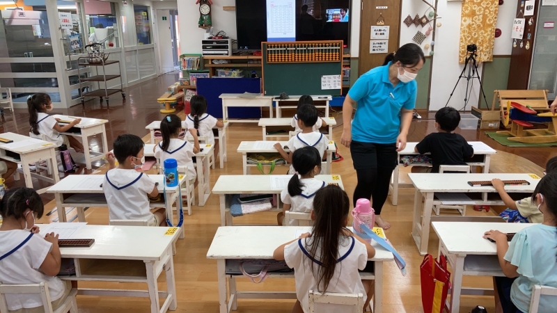 これからの興味の対象にそろばんが加わってくれればいいな ご協力くださっている幼稚園先生も強力な助手さんで大助かり!!