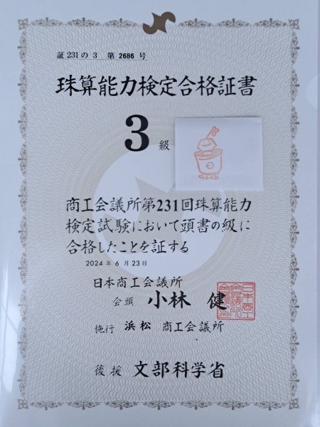 「日本商工会議所 珠算能力検定」の合格証が届き、
