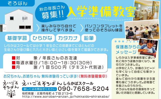 しらかばスクールは2023年8月教室リニューアルオープンしました。タブレットを取り入れた新しい形のそろばんはゲーム感覚で楽しみながら上達できます。実績を持つベテラン指導者と6名のスタッフでたくさんの計算好きのお子さんを育てる「そろばん」教室と今年20年目の留学経験ありの講師が指導する「英会話」スクールです。