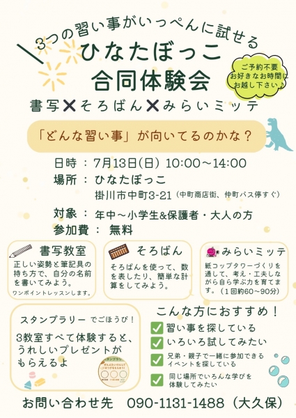 当日は教室がお世話になっている「ひなたぼっこ」さんからの呼びかけで、そろばんのほかにも「書写」や「紙コップタワーづくり」などいろいろな体験ができます。