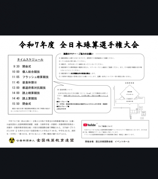 令和7年度全日本珠算選手権大会 YouTubeライブ配信アドレスは下記のリンクから