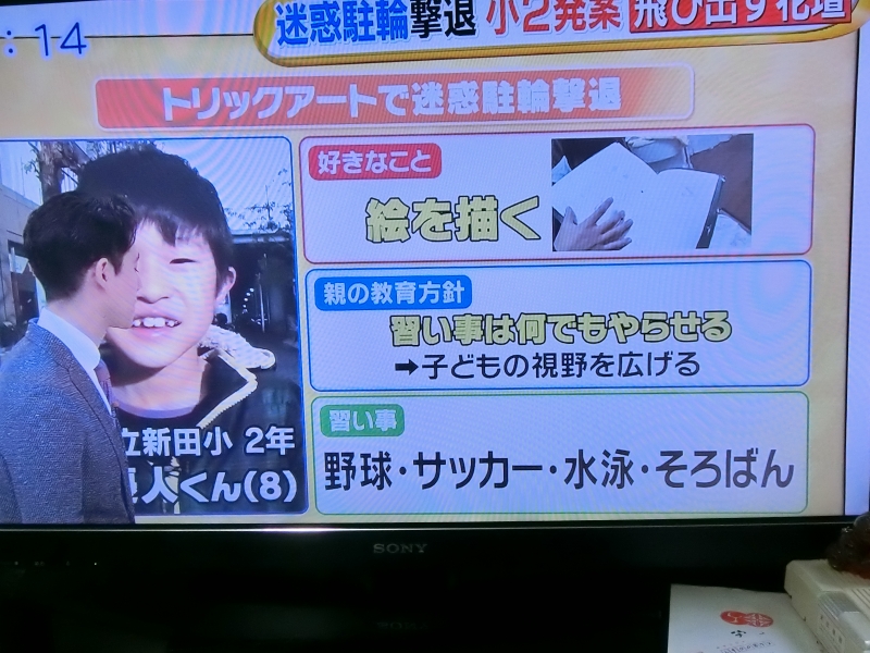 2月19日、朝放送の「グっとラック」という番組で、歩道に「迷惑駐輪」する自転車を無くすのにsごいアイデアを出した小学2年の男児が紹介されている場面があり、その中で、男児の習い事の一つに「そろばん」とありました。