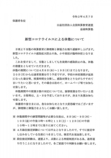 ゴールデンウィーク期間中は、午前授業を行いますので、授業時間の確認をお願いします。なお、5月3日(金)~6日(月)まではお休みとさせていただきます。保護者の皆様には、ご理解とご協力をよろしくお願いします。