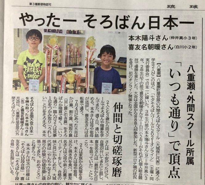 「七夕そろばんワールドon-line2021on-line」大会が行われ、団体戦では外間そろばんスクール全国第6位となりました。