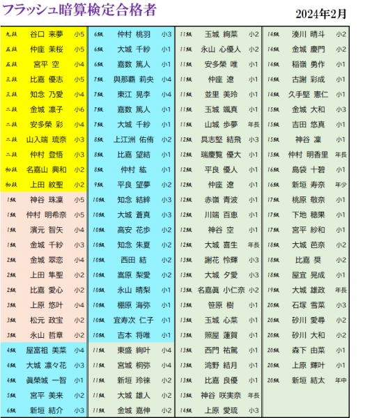 2月度のフラッシュ暗算検定合格者一覧です。