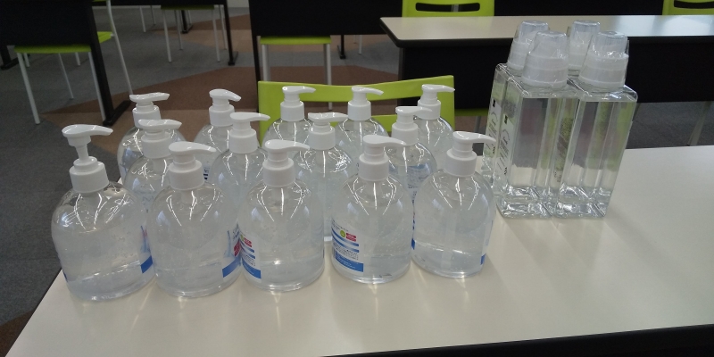 アルコール消毒剤も十分な量を確保。