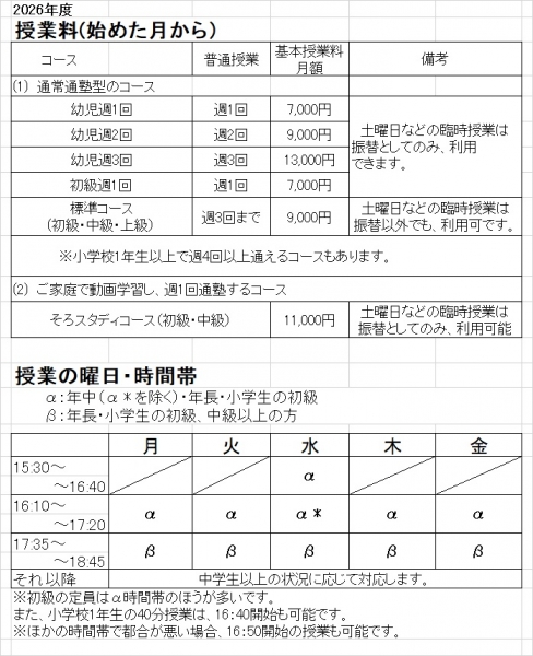 授業料は、週1回で7,000円、週2回で9,000円(小学1年生以上は週3回でも9,000円)となります。月~金曜日から週1~3回選んで通えます。