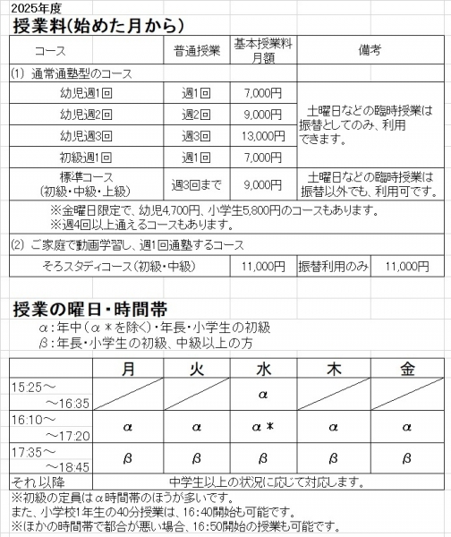 月~金曜日から週1~3回、選んで通えます。月~金曜日とも、16:10開始、17:35開始の授業があります。(水曜日のみ、15:25開始もあります。)また、16:50開始の対応もできる場合があります。