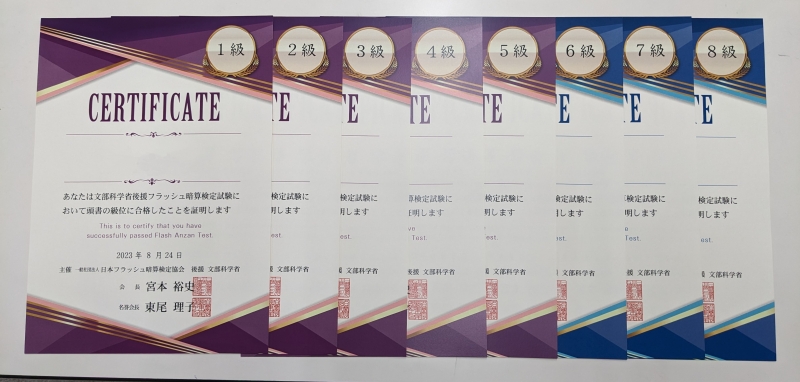 先月受験されたフラッシュ暗算の合格証書が届きました!