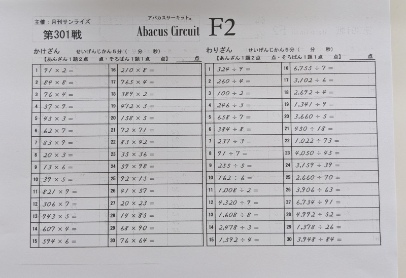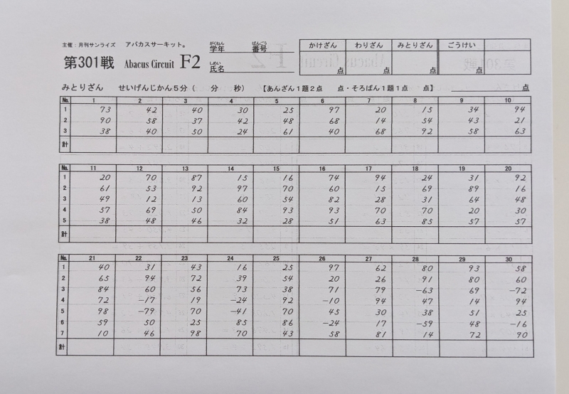 アバカスサーキットは暗算力を強化する目的で作られた、ピラミッド式の問題ですが、詩遥さんは全問暗算で解くことで見事F1達成となりました!