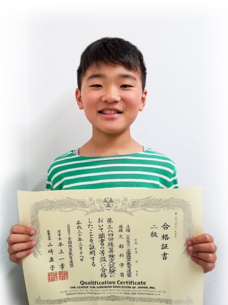 珠算3級合格 岡田直之さん(小6)
