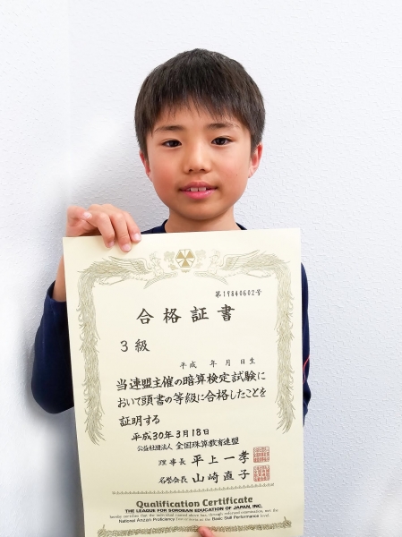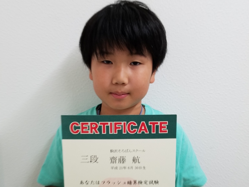 日本フラッシュ暗算検定協会主催の検定試験で、齋藤航君(小3)が見事3段に合格してくれました!