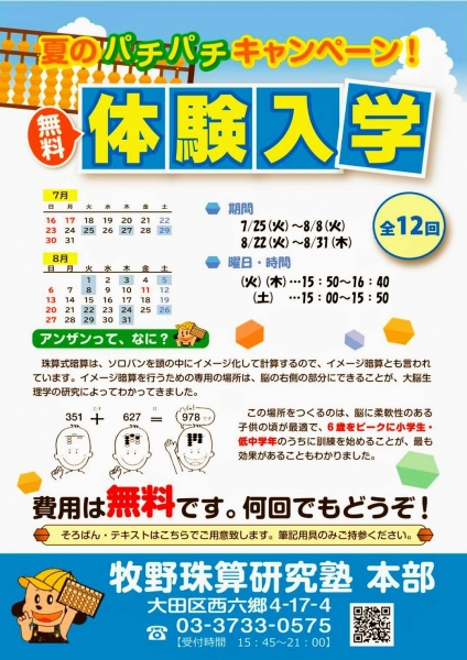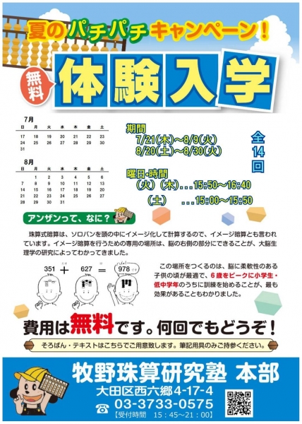 今年も学校の夏休みを利用した、そろばん塾の体験練習がスタートします。