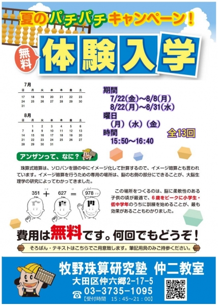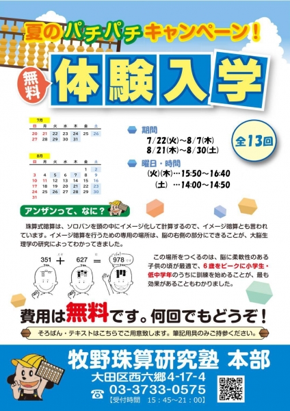 今年も学校の夏休みを利用した、そろばん塾の体験練習が始まります。
