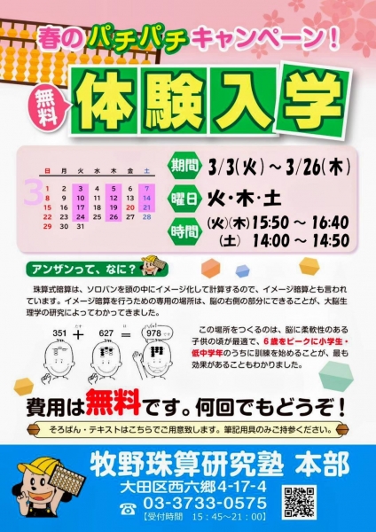 春☆新学期の前に、そろばん・暗算で新しい扉を開けてください。