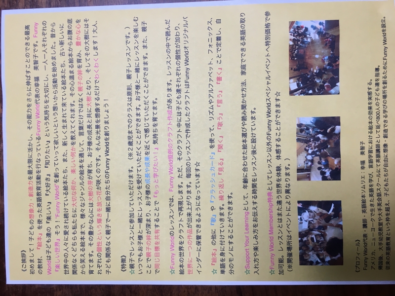 予告しておりました、Funny Worldさんの英語無料体験についてご紹介いたします。先日より、低学年の子にお知らせのお手紙を配りました。
