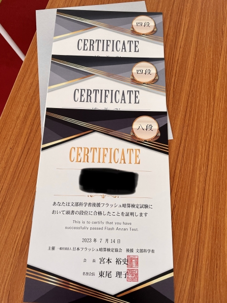 フラッシュ暗算ネット検定が文部科学省の認定となり、賞状が変わりました!
